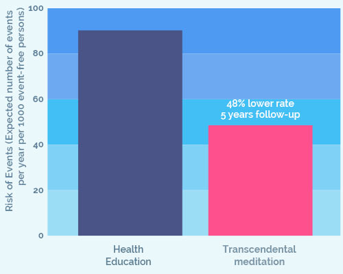Fimm ára rannsókn á sjúklingum með kransæðastíflu sýndi 48% fækkun hjartaáfalla, heilablóðfalls og dauðsfalla hjá þeim sem iðkuðu innhverfa íhugun miðað við samanburðarhópa.